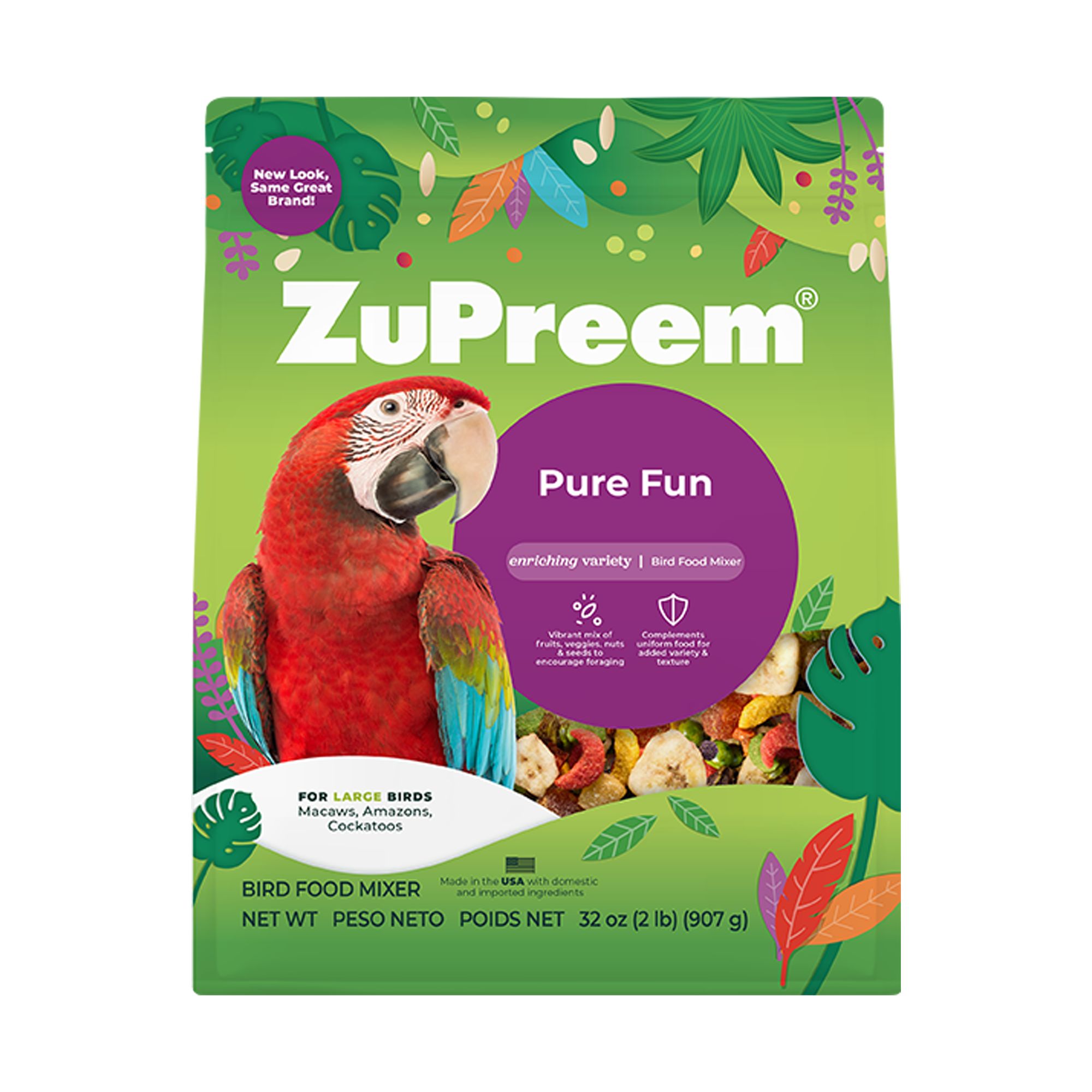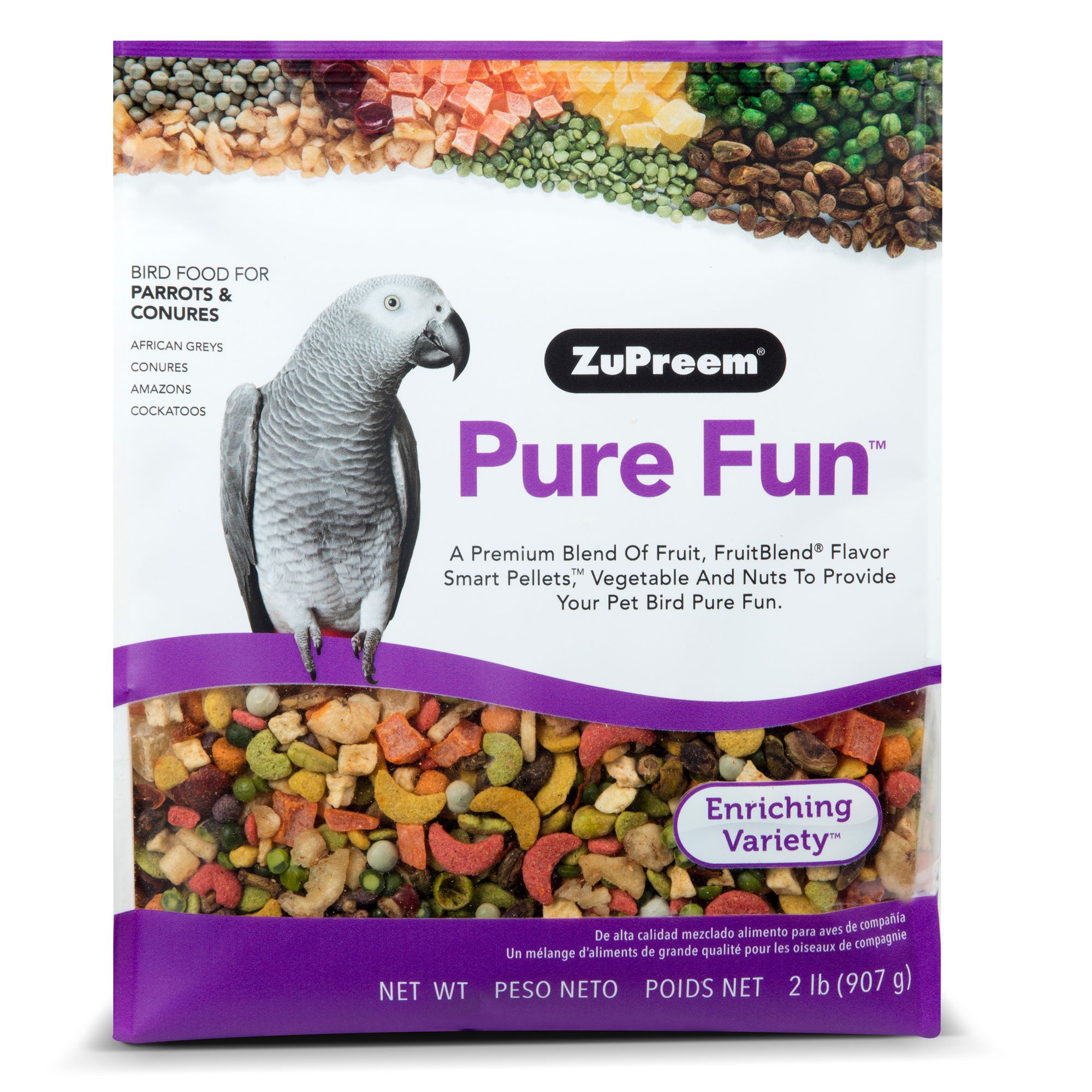DescriptionFeed your bird a premium blend of vegetables, FruitBlend Flavor Smart Pellets, fruit and seeds with ZuPreem Pure Fun Enriching Variety Mix for Medium Birds. This blend features right-sized pieces for Cockatiels, Quakers, Lovebirds, Small Conures and other medium birds, which helps to minimize wasted food as it enriches nutritionally.
