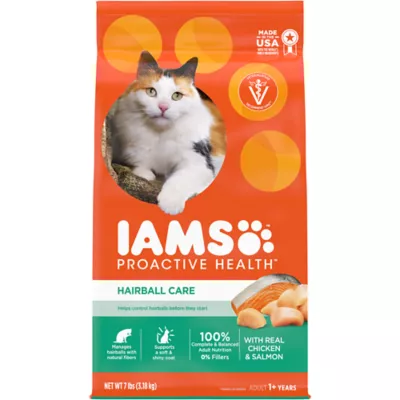 Your cat is unique, that's why IAMS makes a cat food that's just as unique as they are. Help keep your cats at their best with IAMS PROACTIVE HEALTH Adult Hairball Care Dry Cat Food with Chicken and Salmon. This nutrient-rich recipe is designed to help reduce hairballs before they start and support healthy digestion. For outdoor or indoor cats, this cat kibble is made from high-quality proteins like poultry and salmon (chicken is the #1 ingredient) to support a healthy, balanced diet for your furball. The crunchy texture also helps reduce plaque buildup as part of your catâs oral care routine. Plus, with its tailored fiber blend (including beet pulp), it might be just what you need to help your cat with hairball control. So, if you're looking for a hairball care cat food, get your paws on this, and keep your feline happy, healthy, and ready to pounce with IAMS.