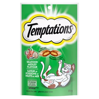 Cats love the delicious, crunchy taste of Temptations, so give your cat purr-worthy Temptations Classic Crunchy and Soft Cat Treats Seafood Medley Flavor, and they'll come running the moment you open the pack. Each of these seafood-flavored cat treats has less than 2 calories and provides an irresistible combination of both crunchy and soft textures. They also come in a stay-fresh pouch, so your feline friend can enjoy their favorite cat snack when you open it, but not when they shouldn't! These Temptations Classic Cat Treats are a perfect addition to your cat's regular feeding routine: Use them as a treat, a meal, or a cat food topper. Temptations Classic Cat Treats are the purr-fect way to show your feline friend how much you care.