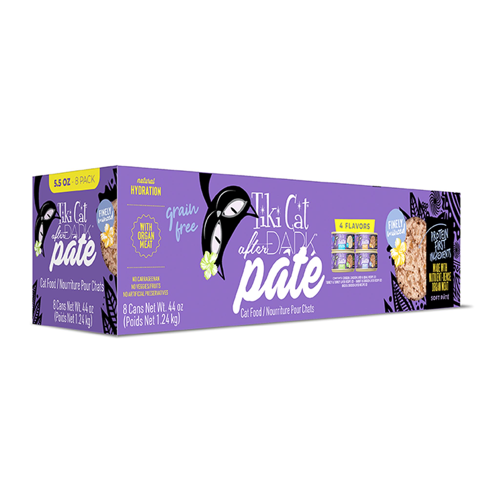 Cats know the best hunting happens after dark. Awaken your cat's instinctual desires with Tiki Cat After Dark Pate. This high-protein meal closely mimics cats' natural prey diets as obligate carnivores, featuring a variety pack of real, finely minced rabbit, lamb, turkey, beef, duck and chicken with organ meat. Each can of Tiki Cat After Dark Pate wet cat food gives cats the high-protein, high-moisture grain free nutrition they need with no carrageenan, no vegetables and no artificial preservatives. Open a can of this nutritionally correct, deliciously indulgent pate cat food and watch your cat go wild!
