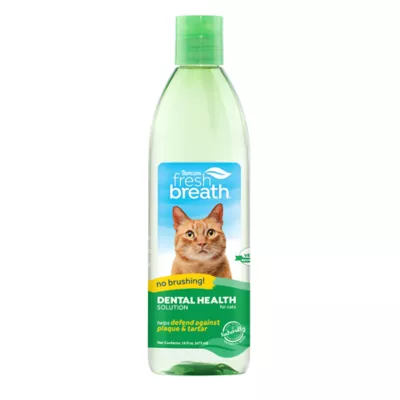 DESCRIPTION TropiClean Fresh Breath offers many oral care solutions to help make your cat's dental care routine easier! TropiClean Fresh Breath Dental Health Solution can help remedy bad breath, support your cat's oral health and give them fresh breath - no brushing required. Dental Health Solution helps freshen breath when used daily as part of an oral care routine. Use in combination with TropiClean Fresh Breath Clean Teeth Oral Care Gel for maximum oral care protection.