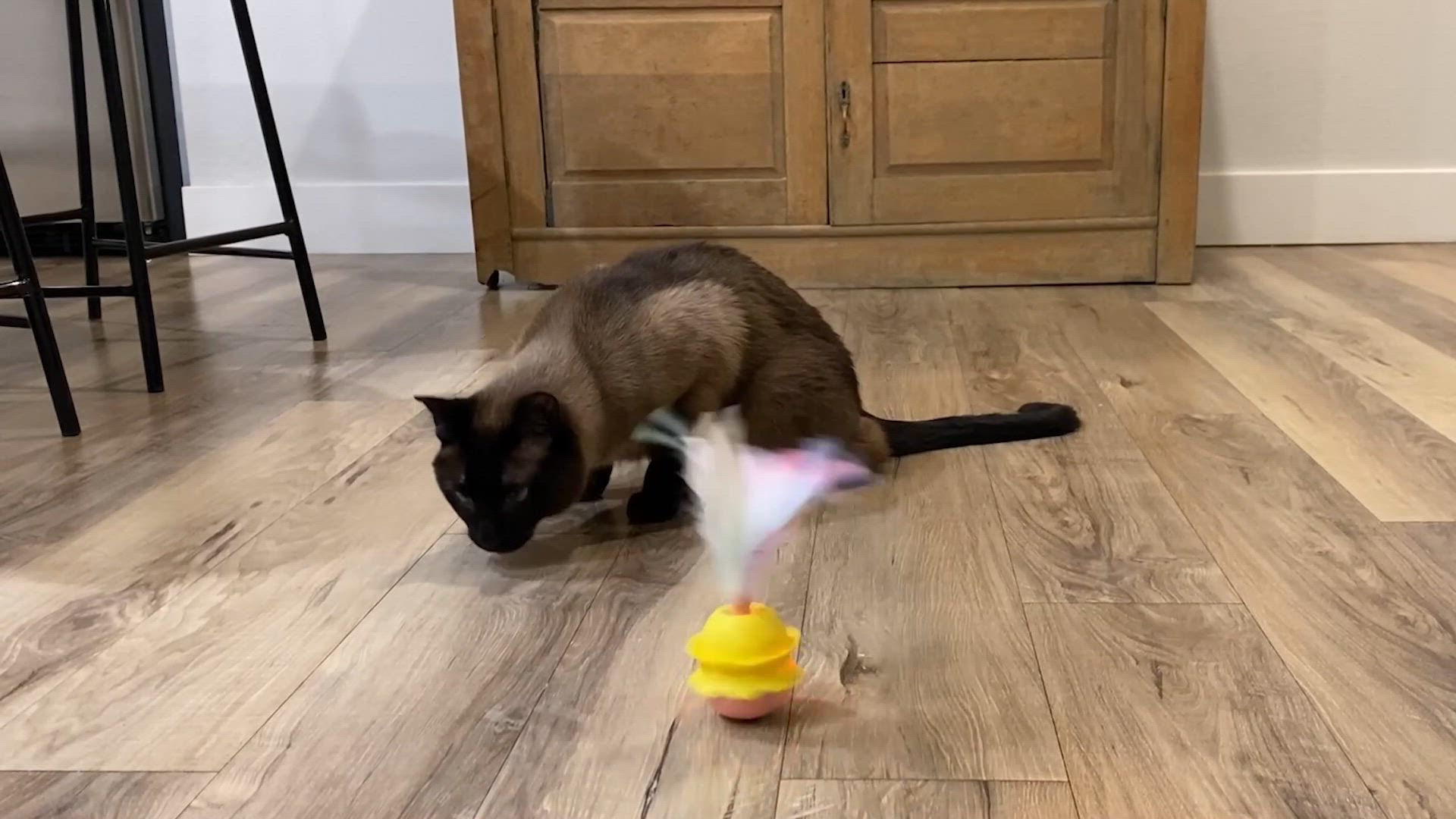 This Whisker City® Interactive Wobble Cat Toy will keep your kitty active and engaged. This fun toy engages in unpredictable twirls, and contains feathers as well. It also chirps and lights ups, keeping cats entertained while engaging their hunting instincts. Only at PetSmart.