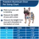 Description and Overview: Is your schedule planned around potty breaks? Let your four–legged friends come and go on their own time with the PetSafe® Freedom® Aluminum Dog and Cat Door. Designed to withstand wear and tear, the metal frame with its reinforced aluminum corners is great for active dogs and multi–pet households. The magnetic, tinted flap, weather stripping and a slide–in closing panel gives you protection against drafts and outdoor temperatures. You can also use the slide–in closing panel to control your pet's access and keep stray animals out of your home. Installing this cat and doggie door is an easy DIY project that fits doors between 3⁄8 and 2 inches thick. With four sizes available, the flexible flap gives pets up to 220 pounds easy access in and out. Trust PetSafe® to help keep your pet healthy, safe and happy.