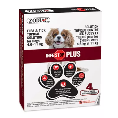 Health Consideration: Flea & Tick Adulticide. Rapidly kills fleas. Controls fleas and ticks within 1 day of treatment. Protects for up to 4 weeks. May reduce flea allergy dermatitis (The successive feeding activity of fleas on pets may elicit a hypersensitivity skin disorder known as flea allergy dermatitis (FAD). Treatment of pets with Zodiac Infestop Plus Flea & Tick Topical Solution for Dogs 4.6-11 KG, may reduce incidence of this condition.)