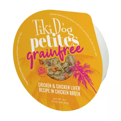 Tiki Dog Aloha Petites is BIG nutrition and flavor designed just for small dogs. This Chicken recipe is bursting with high-quality protein, featuring real shredded chicken and flavorful chicken liver, heart and gizzard. It also offers nutrient-dense superfoods like sweet potato, carrot, kale and flaxseed, plus fiber-rich whole mung beans. All of these ingredients are served in a savory broth and hand-packed in a convenient, ready-to-serve 3-oz. cup. Transform Every Bowl with Tiki Dog. It all starts with the ingredients. You'll see recognizable ingredients you know and trust that deliver a complete and balanced meal for your best friend. What you won't find are by-products, fillers or artificial flavors and preservatives. Tiki Dog products are culinary inspired, high-protein, moisture-rich recipes that include a variety of novel proteins and superfoods. With wet and dry meal options, toppers and treats in a wide range of flavors and textures, you can mix and match in a creative way to enhance mealtime. Experience superior nutrition with Tiki Dog!
