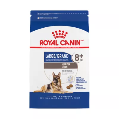 Description: Serve up the tailored nutrition your large-sized dog deserves with Royal Canin Size Health Nutrition Large Adult 8+ Dry Dog Food. This complete and balanced diet provides the nutrients your senior dog needs in a crunchy kibble texture they'll love. Royal Canin Large Adult 8+ Dry Dog Food helps support your dog's bone and joint health with a combination of high-quality minerals and nutrients, while easy-to-digest, high-quality proteins, plus fibers and prebiotics help promote optimal stool quality. This formula also includes minerals and amino acids to help support aging kidney and heart health. Plus, the exclusive kibble dog food is highly palatable and will keep them coming back to their bowl for every meal. Health is something different for every pet. Give your dog carefully selected ingredients that align with their life stage, size, and activity level and take comfort in knowing their food was designed with them in mind.