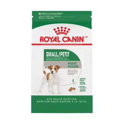SMALL BREED DOG FOOD: Royal Canin Small Adult Dry Dog Food for small dogs 10 months to 8 years weighing 9 to 22 lbs IDEAL WEIGHT: Helps maintain ideal weight by meeting a small dog's specific energy needs STRONG BONES: Helps maintain strong bones with a precise blend of calcium and phosphorus PRECISE NUTRITION: Easy-to-digest proteins and precise levels of various fibers, including prebiotics, to help support a healthy microbiome AGE SPECIFIC FORMULAS: As dogs mature, their nutritional needs change. For small-sized dogs age 8+, check out the Royal Canin Small 8+ dry dog food for a formula specific to their unique needs QUALITY AND SAFETY: Attention to the very smallest details during the formulation and production process helps Royal Canin deliver precise and effective health nutrition for pets THIS BAG CONTAINS 63 CUPS OF FOOD: Refer to the packaging for daily feeding guidelines and to establish your shipping schedule! TAILORED NUTRITION: Check out the full range of Royal Canin wet and dry dog food formulas that offer precise nutrition for dogs of all ages, sizes and breedsSpecies: Dog