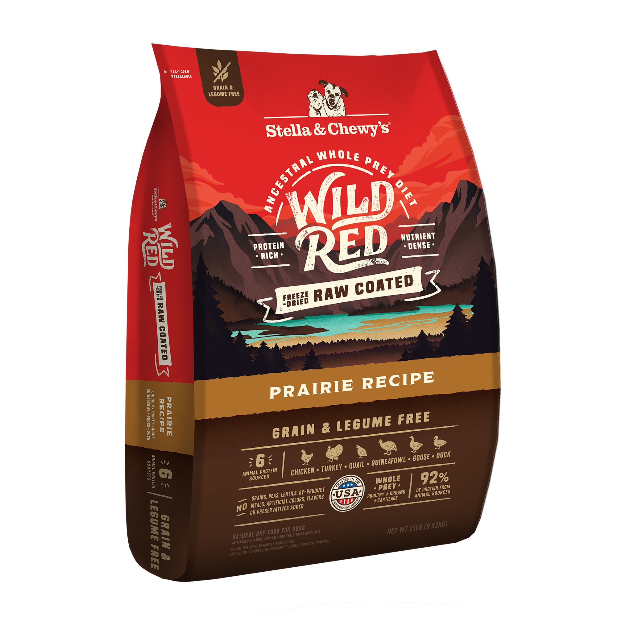 guinea fowl, goose and duck. Grain–free recipe with no white potatoes or legumes. Nutrition of raw in every bite with freeze–dried raw coating, plus freeze–dried raw chunks93% of protein comes from animal sources. Nutrient dense recipe using "whole prey" ingredients – muscle meat, organ meats and cartilage. Supports whole body health with the right blend of vitamins, minerals and amino acids. Includes probiotics for digestive health and taurine for heart health. No peas, lentils, by–product meals, artificial colors, flavors or preservatives added. Made in the USA.