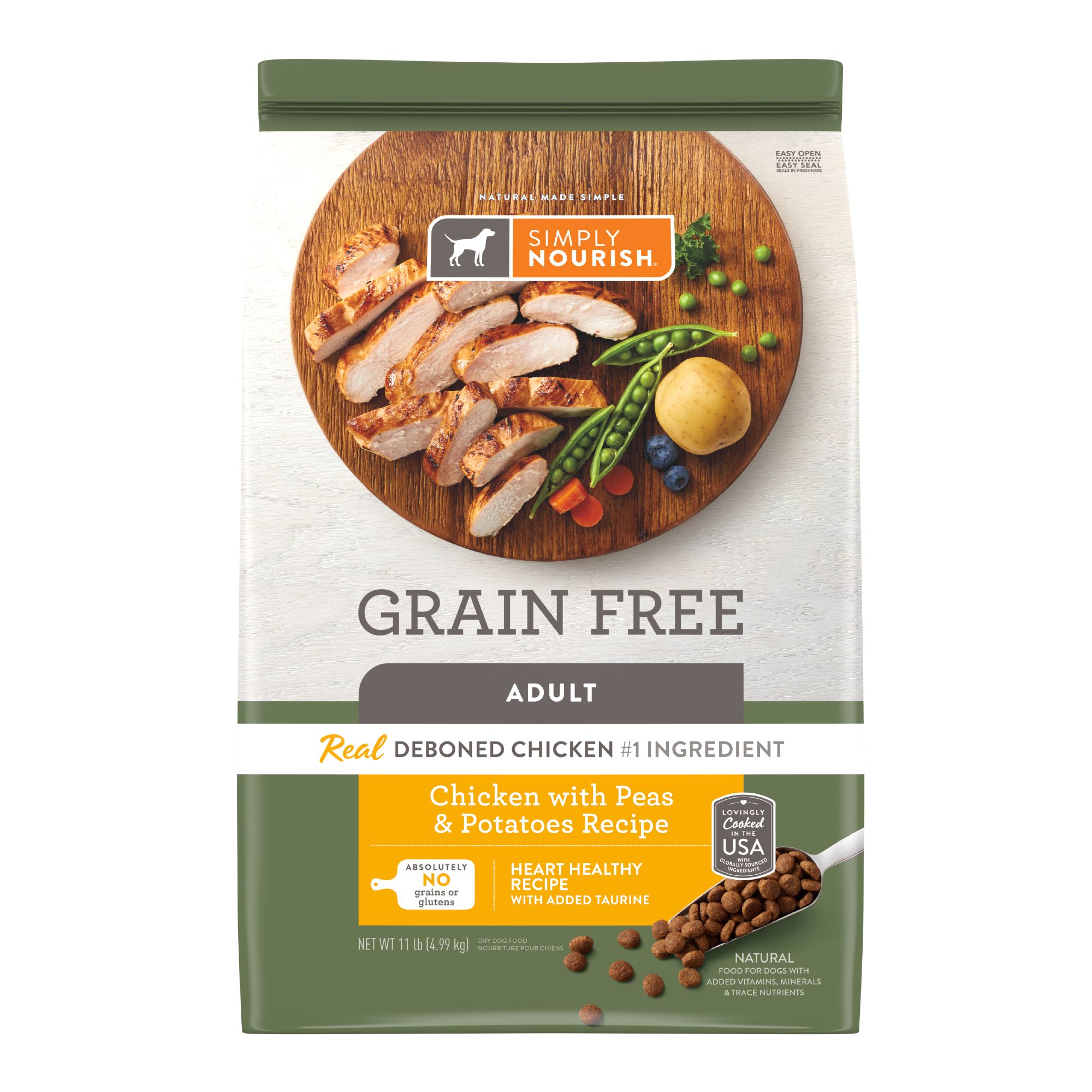 Ingredients: INGREDIENTS: Deboned Chicken, Chicken Meal (source of Glucosamine and Chondroitin Sulfate), Peas, Dried Ground Potatoes, Chickpeas, Lentils, Dried Plain Beet Pulp, Flaxseed, Chicken Fat, Natural Flavor, Dried Chicory Root, Taurine, Choline Chloride, Spinach, Broccoli, Vitamin E Supplement, Carrots, Parsley, Apples, Blueberries, Kale, Mixed Tocopherols added to preserve freshness, Niacin, Zinc Proteinate, Ferrous Sulfate, Zinc Sulfate, Vitamin A Supplement, Iron Proteinate, Ascorbic Acid (Vitamin C), Thiamine Mononitrate, d–Calcium Pantothenate, Sodium Selenite, Pyridoxine Hydrochloride, Copper Sulfate, Manganese Sulfate, Riboflavin, Manganese Proteinate, Copper Proteinate, Biotin, Vitamin D3 Supplement, Yucca Schidigera Extract, Vitamin B12 Supplement, Folic Acid, Calcium Iodate, Dried Enterococcus faecium Fermentation Product, Dried Bacillus licheniformis Fermentation Product, Dried Bacillus subtilis Fermentation Product, Rosemary Extract, Green Tea Extract, Spearmint Extract. This is a naturally preserved product Manufactured in a facility that also processes grains