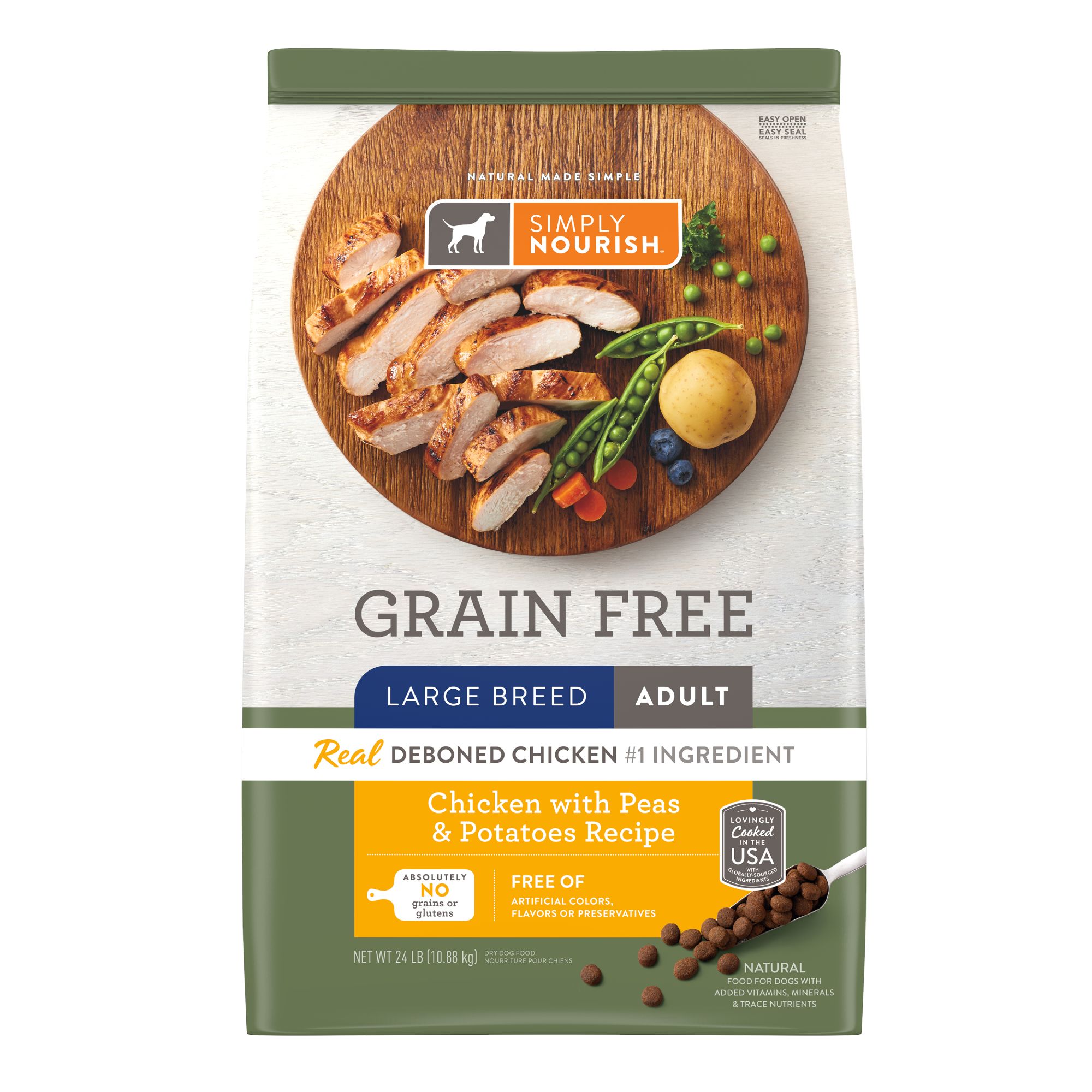 GRAIN–FREE LARGE BREED ADULT DRY FOOD: High quality protein from chicken, healthy fats and fiber are expertly balanced to deliver a complete, grain free food packed with the nutrients your large breed needs to thrive.