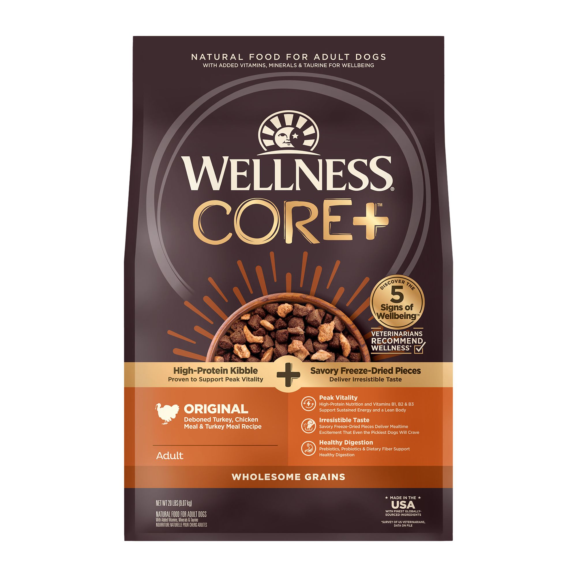 GRAIN–FREE ADULT DRY DOG FOOD: Protein packed, nutrient dense kibble combined with 100% raw freeze–dried turkey pieces for a crave worthy savory dog food; with optimal protein levels, high fiber and calorie content your dog needs to thrive.