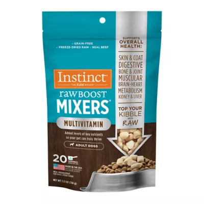Instinct Raw Boost Mixers Multivitamin provides 27 guaranteed nutrients selected by our board-certified vet nutritionist customized for dogs in their adult years. A comprehensive blend of scientifically studied ingredients support strong foundational health. Give a daily boost of raw for overall health. Instinct Raw Boost Mixers Multivitamin for Adult Dogs is formulated to meet the nutritional levels established by the AAFCO Dog Food Nutrient Profiles for maintenance. All Instinct products are 100% Satisfaction Guaranteed. If you or your pet are not completely satisfied with this or any Instinct product, simply return the unused portion, along with the original sales receipt, to the retailer for a complete refund or replacement.