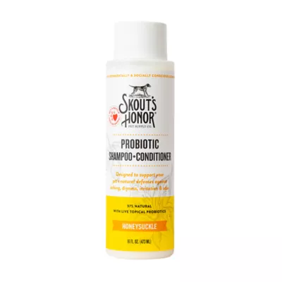 Skout's Honor Probiotic Honeysuckle Shampoo & Conditioner gently cleans and moisturizes the coat, leaving fur silky and smooth. Hydrating, conditioning, and non-medicated, this shampoo and conditioner contains avocado oil and topical probiotics that help support a healthy microbiome to defend against common skin problems such as itching, odor, dryness, dandruff, hot spots, yeast and excessive shedding. At Skout's Honor, our goal is simple: curate the best technologies and create products that greatly improve the experience of living with and loving our pets.