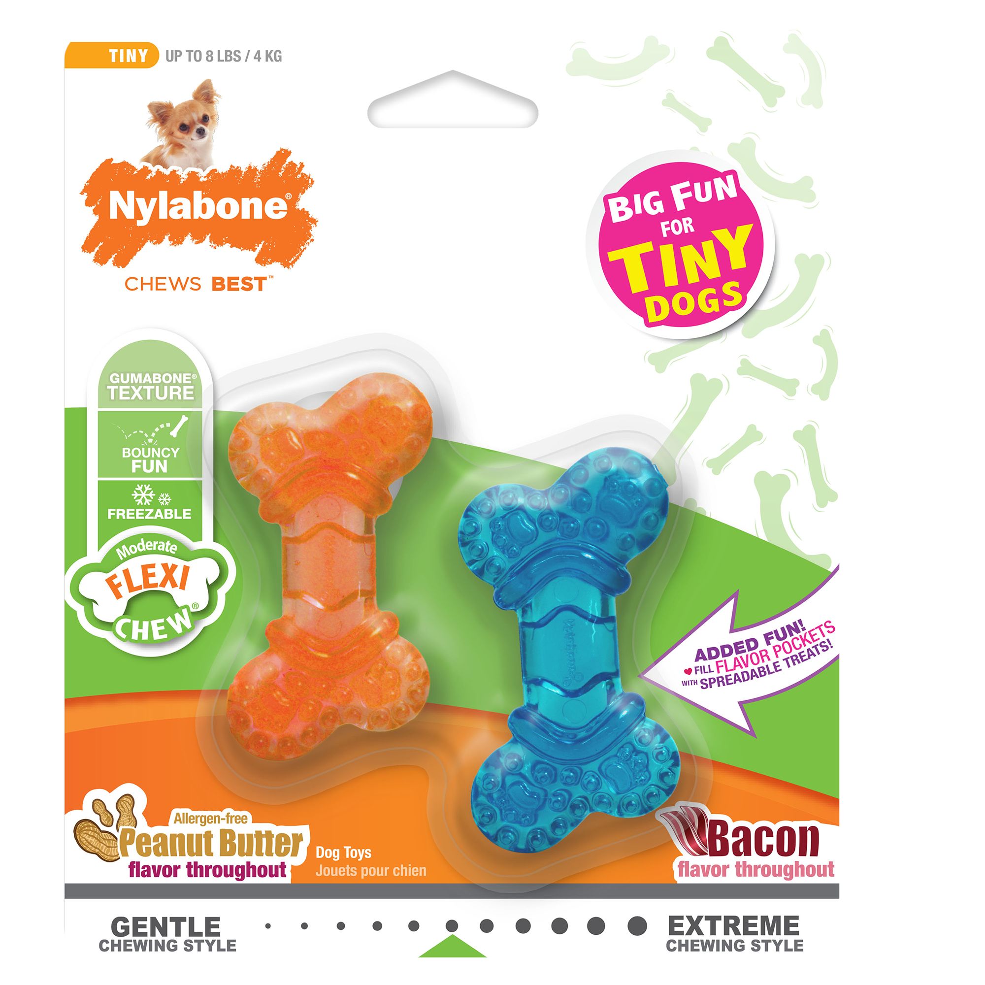 Inspired by that distinct "this is the life" feeling of satisfaction, Nylabone's Gourmet Style chew toys are made to wow flavor-obsessed dogs who crave a new type of chewing experience. Applying decades of expertise, this latest formula is uniquely crafted with enticing flavor bits you can see - leaving even the most particular dogs with a sense of chewing gratification! Featuring 2 chew toys, this twin pack offers dogs a delicious way to enjoy the authentic bone shapes they love. Both long-lasting chew toys are made of durable material that keeps dogs occupied and helps clean their teeth as they chew. Satisfy your furry friend's natural chewing instincts with these veterinarian-recommended chew toys for dogs that are proudly made in the USA.