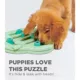The Nina Ottosson by Outward Hound Interactive Puppy Hide N' Slide puzzle game is a fun way to engage your pup's mind and activate their problem solving-skills. This level 2 intermediate puzzle dog toy comes with two types of hiding spots for snacks or kibble for a total of 14 treat compartments: under the swiveling flippers and in the hollow sliding blocks. You can vary the difficulty level by placing treats just under the flipper for newcomers. And once your puppy gets the hang of it, you can increase the challenge by placing the treats in the hollow block and watching your dog try to figure out how to slide it back and forth to release the treat into the flipper compartment.