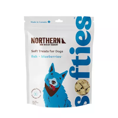 Northern Softies Fish & Blueberries Treats are soft & chewy and sure to be your pup's new favorite high-value treat. Made with fresh lake fish and Blueberries, this recipe is hypoallergenic and great for dogs with sensitive tummies. These wheat-free dog treats are made with only 8 natural and locally sourced ingredients and have a non-sticky texture that makes them the perfect on-the-go reward for dogs of all ages. Packed with flavour and only 3 calories per treat, Northern Softies are ideal for frequent treating or training.