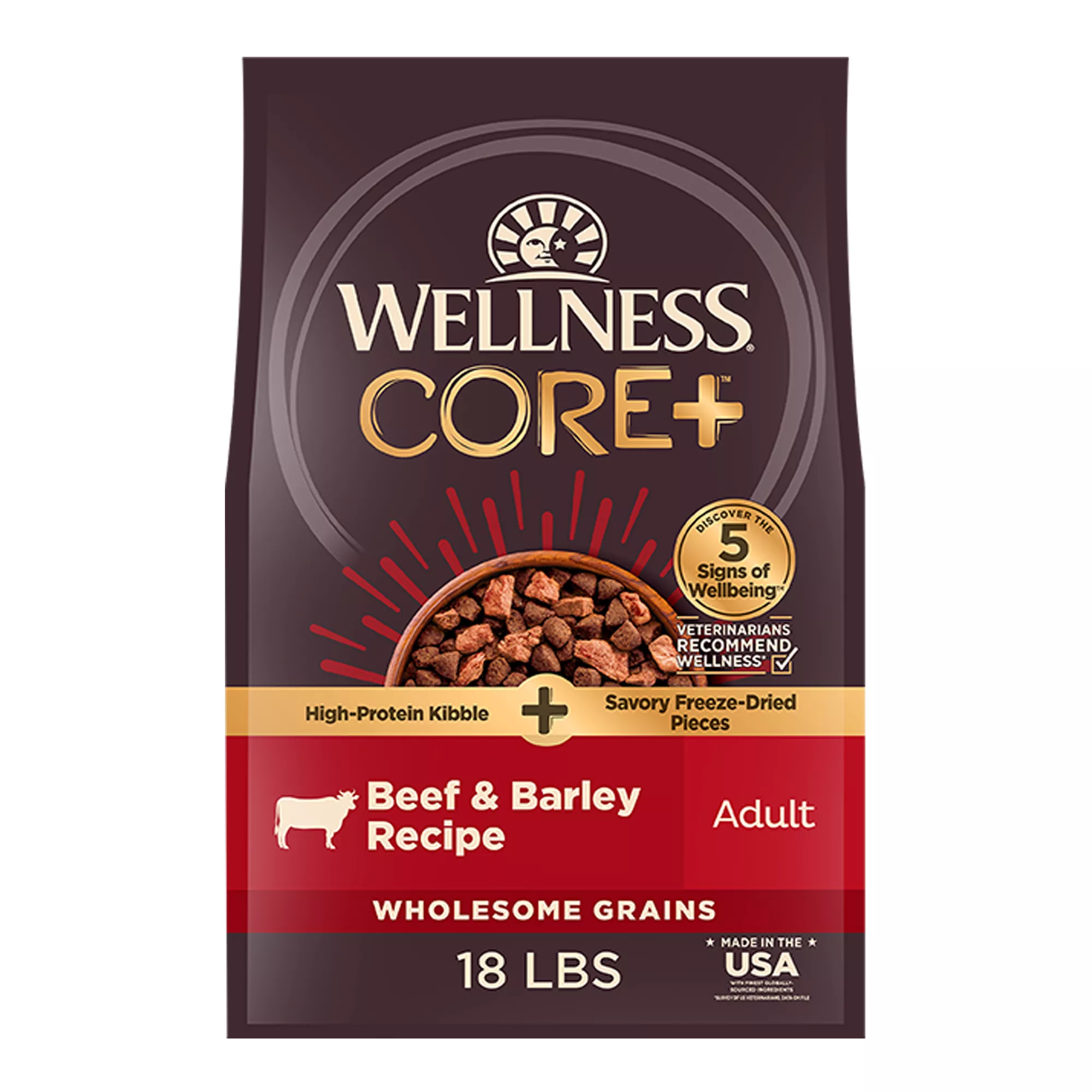 Wellness Core+ High Protein Kibble + Savory Freeze-Dried Pieces - Beef & Barley, Wholesome Grains
