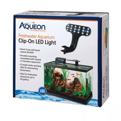 This elegant, super thin Clip-On LED Light will provide optimal lighting for a bright, thriving environment. This light is equipped with a soft-touch switch and a versatile mounting screw, for use on framed and frameless aquariums. It is loaded with blue and white LED and designed for use on aquariums up to 20 gallons in size. The Freshwater Clip-On Light features 21 bright LEDs for shimmering illumination and is ideal for freshwater aquariums. Aqueon products offers a wide range of items so that you can build and maintain a healthy aquatic environment. All the essentials from fish tanks, filters, lighting, food, care, and other supplies that your pet fish needs. We make it easy for you to get your first aquarium and to grow in the hobby as you become more of a fish expert with every step you take and every new thing you learn. For those seasoned hobbyists, we are committed to aquarium product innovation so that we continue to offer products that get you excited. With the Aqueon brand, it's all about the fish.