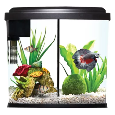 that allows you to house fish on separately on opposite sides of the tank if need be. It also features a convenient door on the hood for easy feeding as well as aesthetically appealing LED lights. Only at PetSmart.