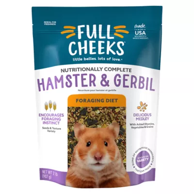 Full Cheeks Hamster & Gerbil Foraging Diet is made with a medley of grains, seeds and vegetables for a delicious mix of flavors and textures that encourages your pet's natural foraging instincts. We believe caring for your furry little one should be as easy as loving them. And now it can be. Our nutritious diets make it simple to fill their cheeks and little bellies, so all they need to do is what they do best: Give lots of love. Only at PetSmart.