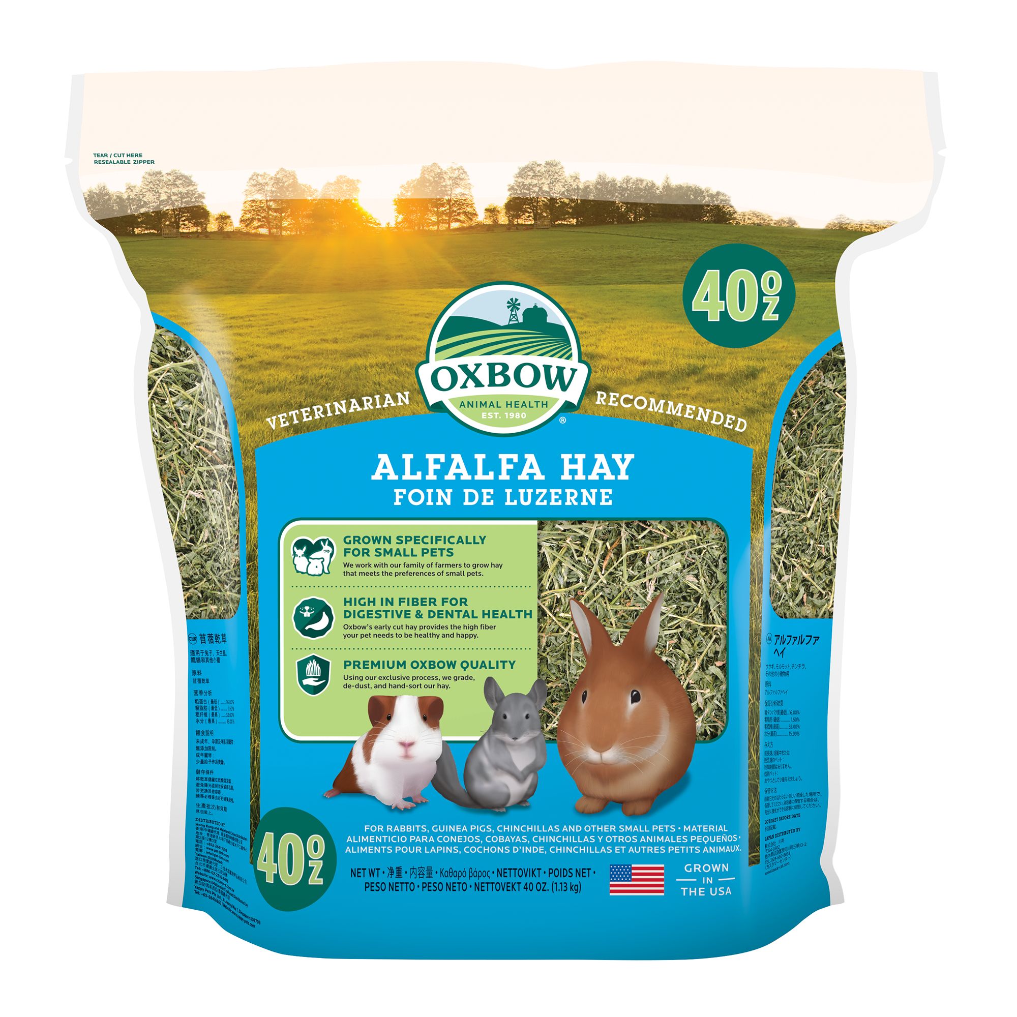 Aromatic, high-fiber Orchard Grass Hay from Oxbow is hand-selected to deliver a sweet smell and soft texture that rabbits, guinea pigs, chinchillas, and other small pets love. The fragrant aroma of Orchard Grass Hay will stimulate your pet's appetite and encourage consumption. Your pet should have unlimited grass hay every day.